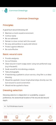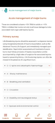 தீக்காயங்களுக்கான முதல் உதவி, அதன் உடலியல் (physiology), கடுமையான தீக்காயங்களை கையாளுதல், இரசாயன மற்றும் மின்சார தீக்காயங்கள், அத்துடன் தீக்காய அறுவை சிகிச்சைகளுக்கான சம்மதம் பெறுதல் போன்ற அத்தியாவசிய தகவல்களை இந்த செயலி வழங்குகிறது. கை மற்றும் கால்களில் ஏற்படும் அதிர்ச்சிகரமான காயங்கள், தொற்றுகள், மீண்டும் பொருத்தும் நுட்பங்கள் (replantation), அத்துடன் தோல் உடற்கூறியல், தோல் புற்றுநோய்கள் (Basal cell carcinoma, Squamous cell carcinoma, Melanomas) மற்றும் பல்வேறு வகையான தோல் புண்கள் பற்றிய விரிவான விளக்கங்கள் இதில் அடங்கும். மார்பக மறுசீரமைப்பு (breast reconstruction), வயிற்றுப் பகுதியின் சீரமைப்பு (abdominoplasty), கார்மல் டன்னல் சிண்ட்ரோம் மற்றும் பல்வேறு அழகுபடுத்தும் நடைமுறைகள் (liposuction, lipofilling) குறித்த தகவல்களும் இதில் முழுமையாக தொகுக்கப்பட்டுள்ளன.