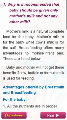 தாய்ப்பாலின் முக்கியத்துவம் மற்றும் அதன் மகத்துவம், தாய்க்கு ஏற்படும் நன்மைகள், கர்ப்ப காலத்தில் தாய்ப்பாலூட்டத் தயாராவது எப்படி, சிசேரியனுக்குப் பிந்தைய தாய்ப்பாலூட்டல், சீம்பாலின் நன்மைகள், எவ்வளவு நேரம் மற்றும் எத்தனை முறை தாய்ப்பால் கொடுக்க வேண்டும், குழந்தையை சரியான நிலையில் வைத்து பாலூட்டுதல், முலைக்காம்புகளில் ஏற்படும் வலி மற்றும் வெடிப்புகளுக்கான காரணங்கள் போன்ற பல முக்கிய தலைப்புகளை இந்த செயலி உள்ளடக்கியுள்ளது. மேலும், குழந்தைக்குப் போதுமான பால் கிடைக்கிறதா என்பதை அறிவது எப்படி, பணிபுரியும் தாய்மார்களுக்கான வழிகாட்டுதல்கள், குழந்தையின் பொதுவான பராமரிப்பு முறைகள், திட உணவை ஆரம்பிப்பது மற்றும் அதன் அளவு, தாய்ப்பாலை வெளியேற்றும் முறைகள், குழந்தையைத் தூக்கும் பல்வேறு நிலைகள் என விரிவான தகவல்களை ஓர் இடத்தில் அள்ளித் தருகிறது.
